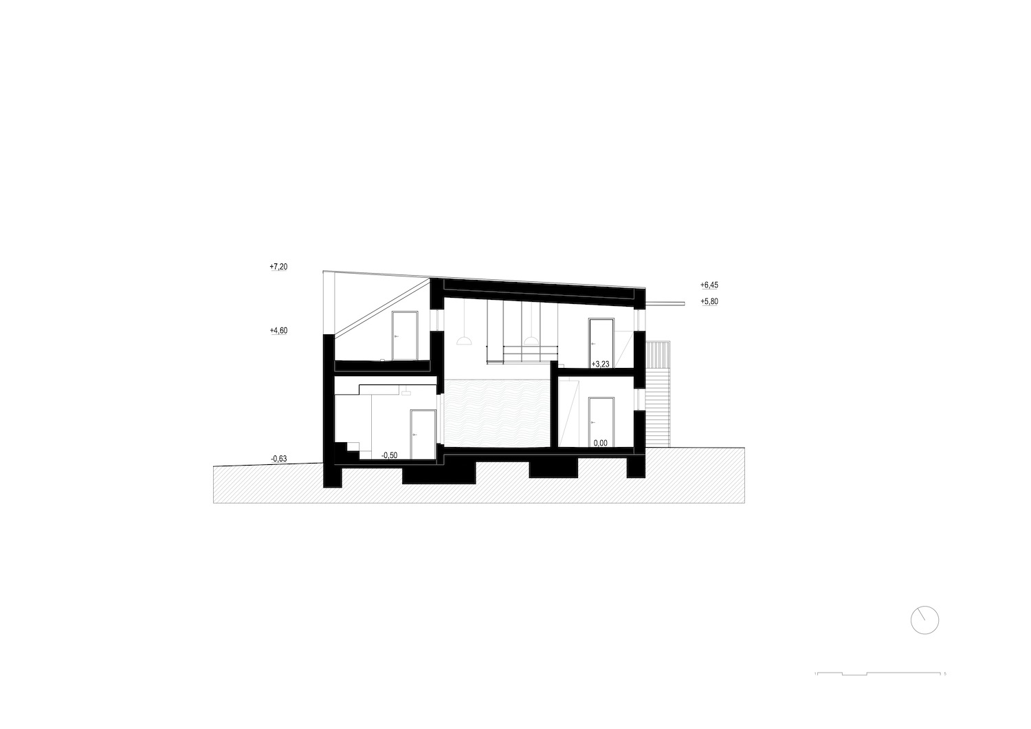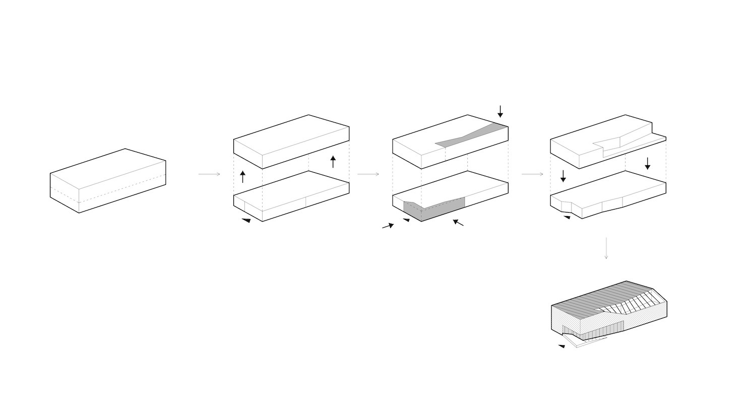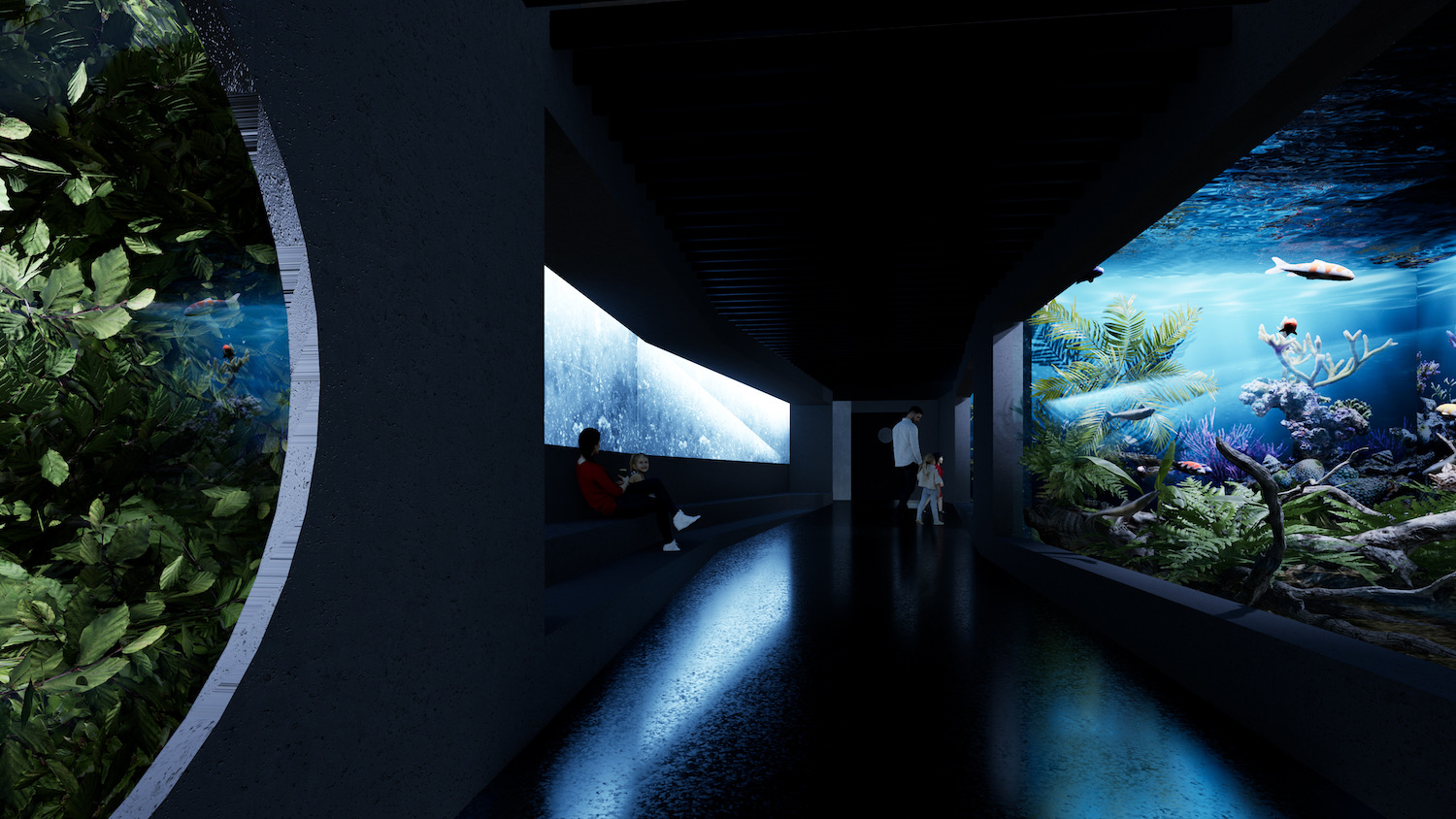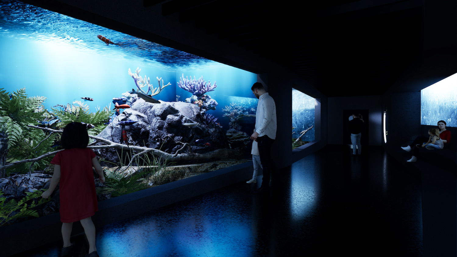 Hmotové a architektonické řešení vychází z polygonálního dvoupatrového objektu, který byl promodelován k dosažení lepší čitelnosti hlavního vstupu pro návštěvníky na SV konci a v úrovni druhého podlaží byl redukován kvůli minimalizaci obestavěného prostoru. Takhle deformovaná hmota byla sjednocena výraznou dynamickou atikou a doplněna šikmými trámci v úrovni střechy. Materiálově je objekt navržen s fasádou z maloformátových hliníkových střešních šablon, nepřímo odkazující k povrchu těla budoucích obyvatel objektu. Naopak interiér odkazuje tlumeným osvětlením a povrchy z pohledového probarveného betonu k podmořským hlubinným jeskyním a dává tak vyniknout zářící expozici akvárií. Materiálové řešení provozní části spočívá v přísné funkčnosti – omyvatelná průmyslová stěrka na podlahách, pohledový železobeton na stěnách, nerezové chráničky přiznaných rozvodů po stěnách. Zároveň je zde přístup do technické místnosti budovy a po schodech v jižním rohu objektu do 2.NP. Expoziční nádrže jsou navrženy jako dva 90 m3 prostory z konstrukcí z železobetonu opatřené vhodnou vrstvou hydroizolační stěrky a doplněné o dvě boční menší nádrže o kapacitě 16 /27 m3. Prosklení nádrží je navrženo jako akrylátová stěna s rozměrem 6,2 x 2,3 m kotvená přes ocelový těsnící profil do ŽB ostění stavebního otvoru. Předběžná dimenze akrylátové stěny je 120 mm.