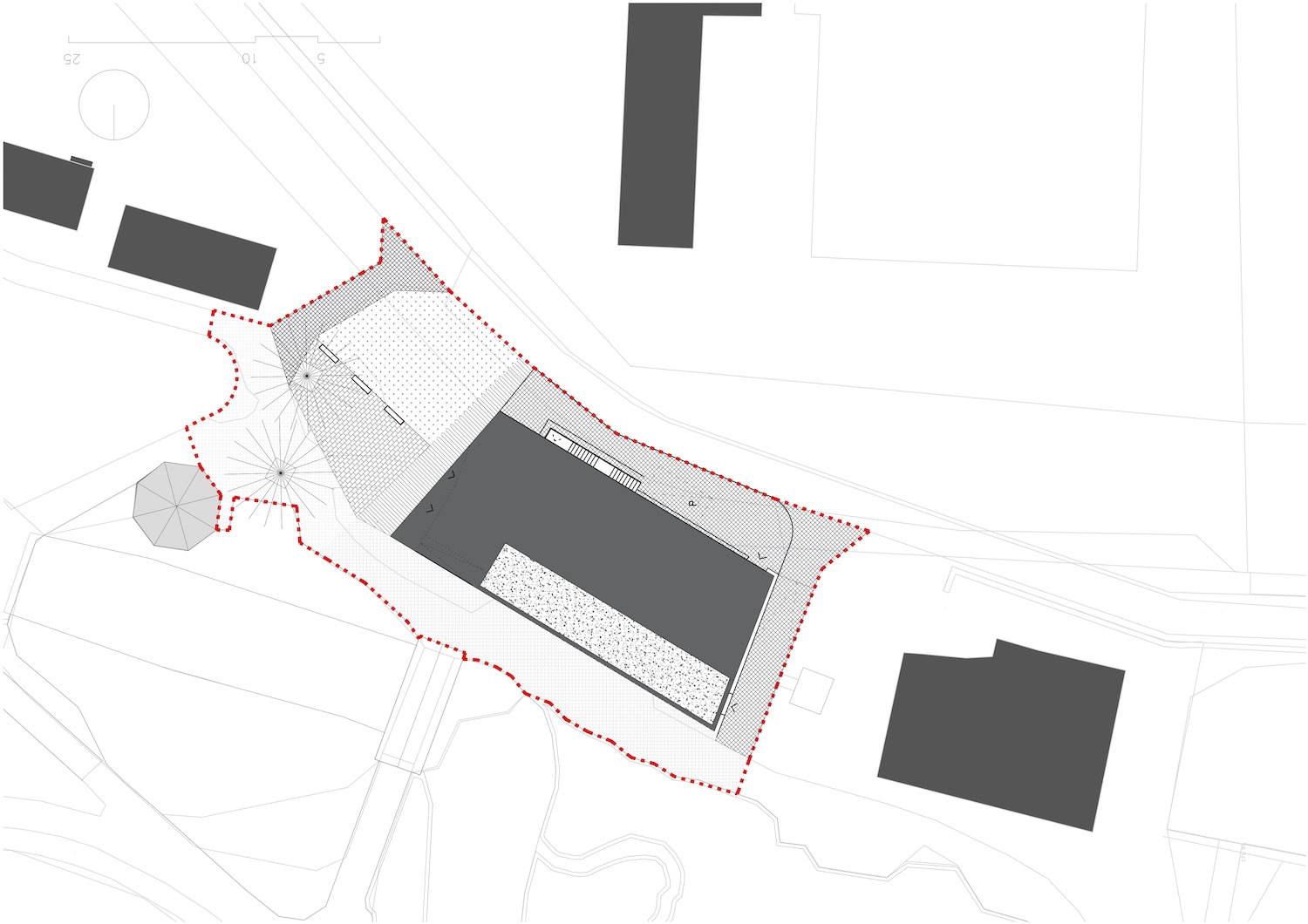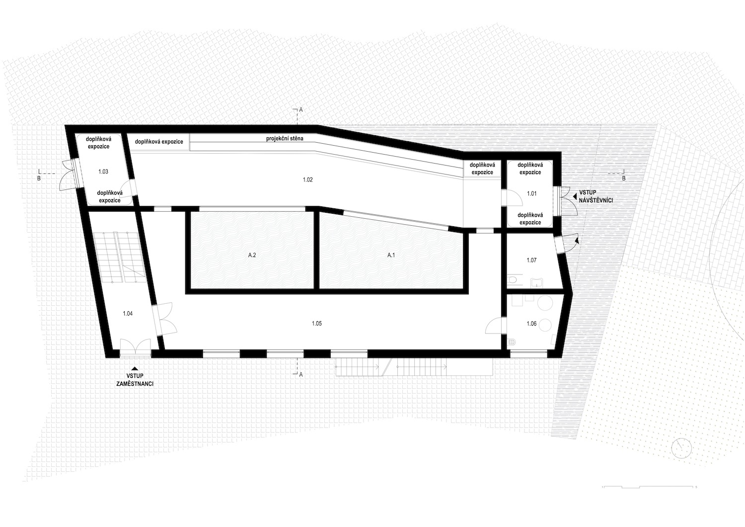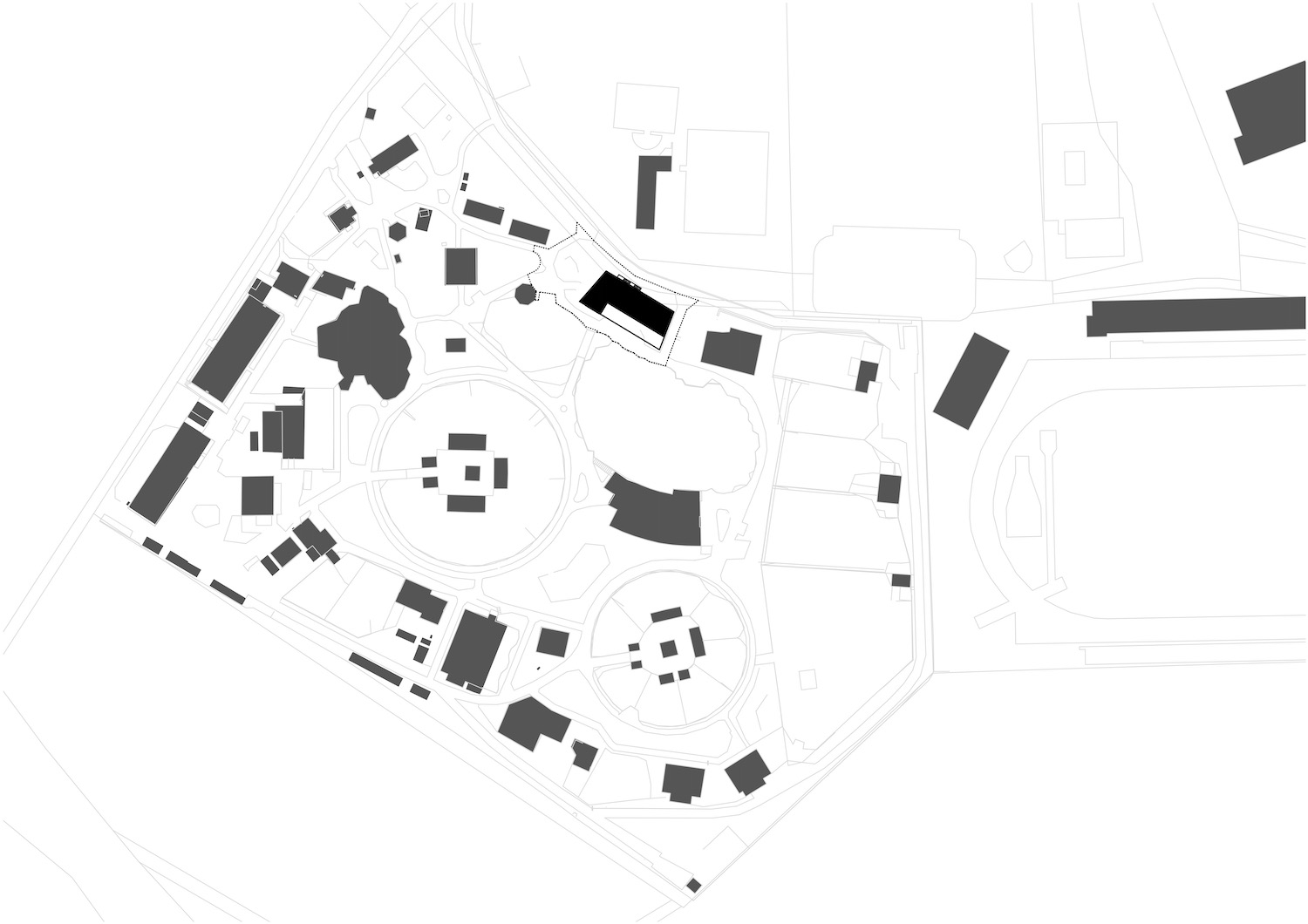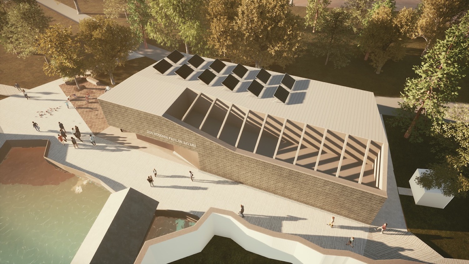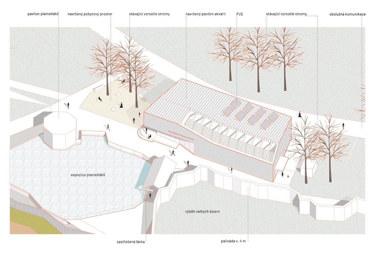 Podélný objekt s rozměry cca 30 x 14 m je orientován rovnoběžně s návštěvnickou trasou mezi expozici plameňáků a stávajícími akvárii s hlavním návštěvnickým vstupem na SV štítu objektu. Před objektem je navrženo v okolí ponechaných vzrostlých dubů malé pobytové prostranství vymezené mlatovou plochou doplněnou o mobiliář laviček z masivních dřevěných hranolů.