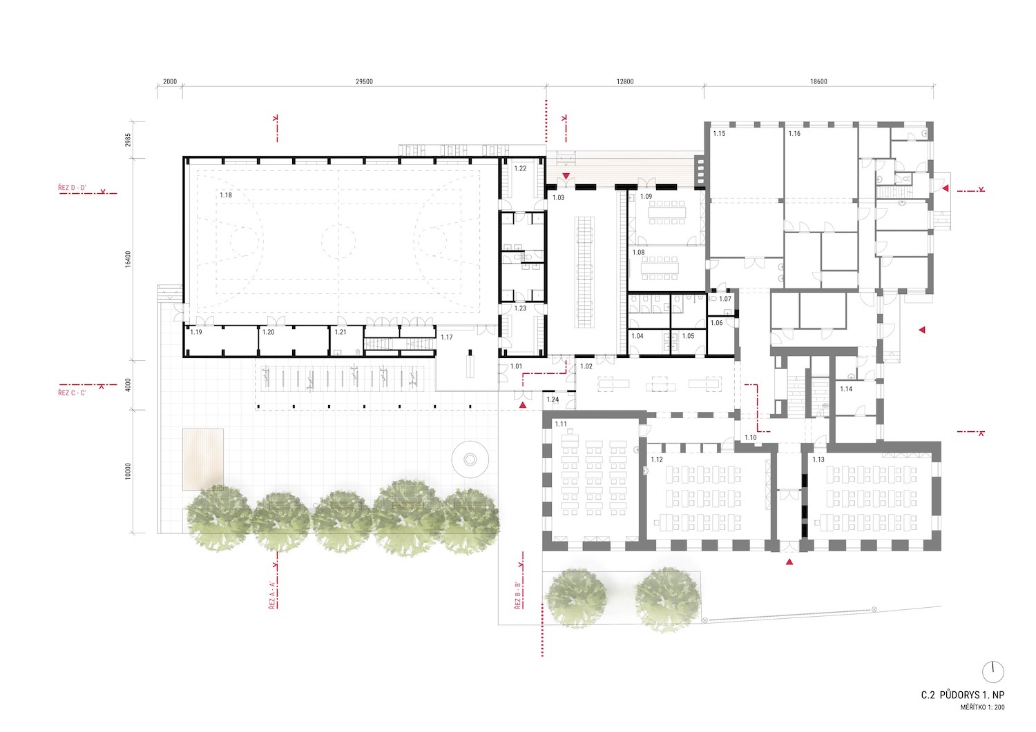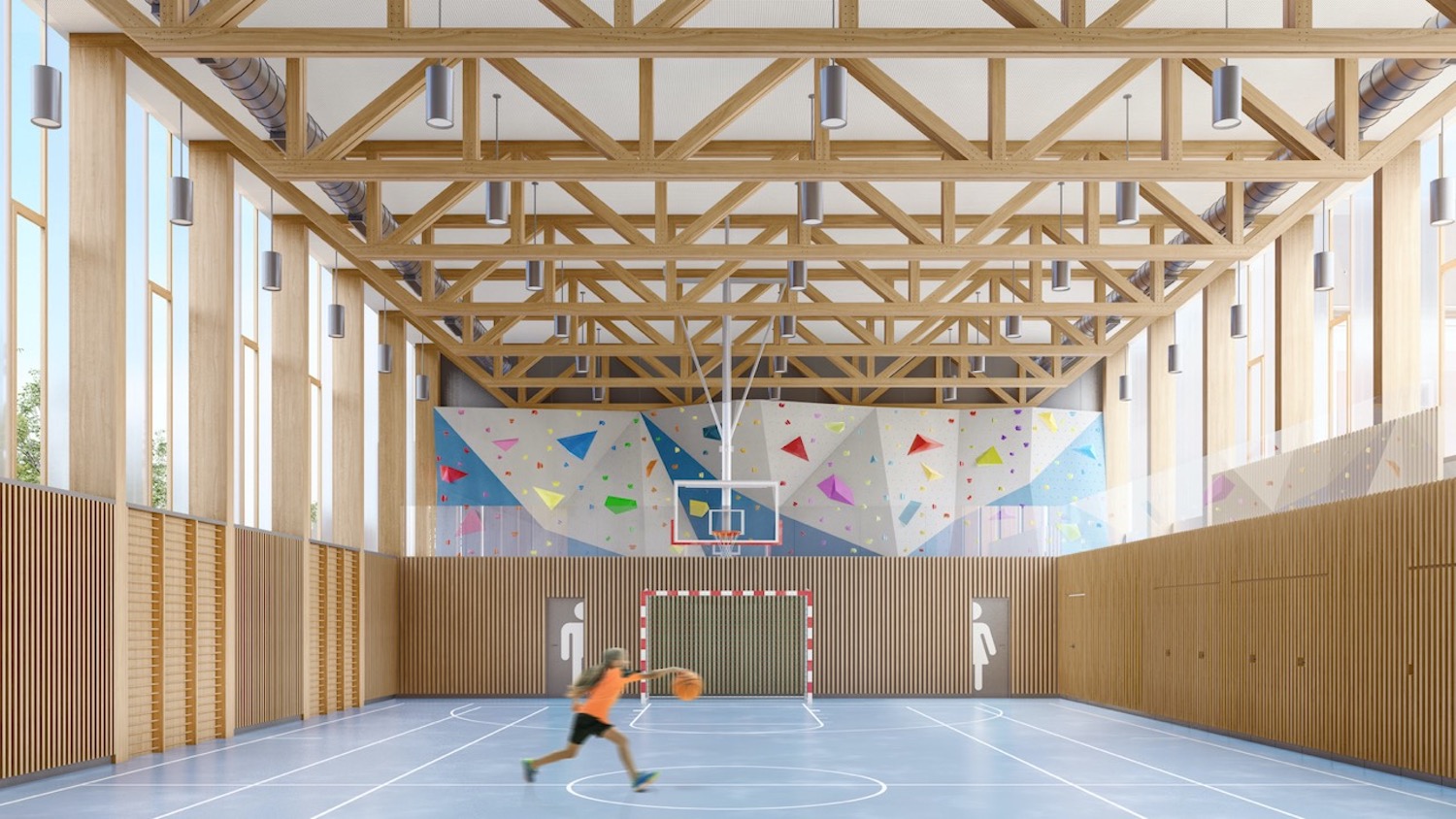 Hlavním prvkem přístavby je tělocvična se samostatným zázemím. Funkčně je možné tělocvičnu zcela oddělit od provozu školy a tím zabezpečit samostatný provoz. Sportovní plocha je přístupná přes vestibul přímo ze společného zádveří nebo přes průchozí šatny s hygienickým zázemím. Tyto šatny navazují přímo na školní šatnu, čímž je umožněn hygienický filtr pro školní výuky tělovýchovy. Školní šatna má dostatečnou kapacitu a je navržená formou uzamykatelných skříněk s přímým napojením na školní pozemek a pobytové schody. Sportovní hala je vybavena tribunou, přístupnou z vestibulu s možností přezutí a uložení venkovní obuvi. Tribuna se dělí na dvě části. V podélné části haly slouží jako tribuna na stání pro pozorování sportovních akcí. Širší část v čele haly je vybavena lezeckou stěnou pro samostatnou sportovní aktivitu bouldering, který je interiérovou formou lezeckého sportu nabízející různou technickou náročnost lezení bez jištění. Bezpečnost je zde zajištěna měkkou dopadovou plochou na podlaze.