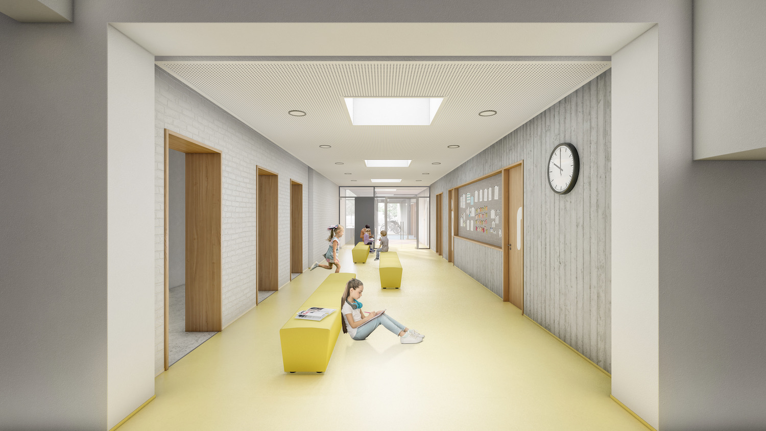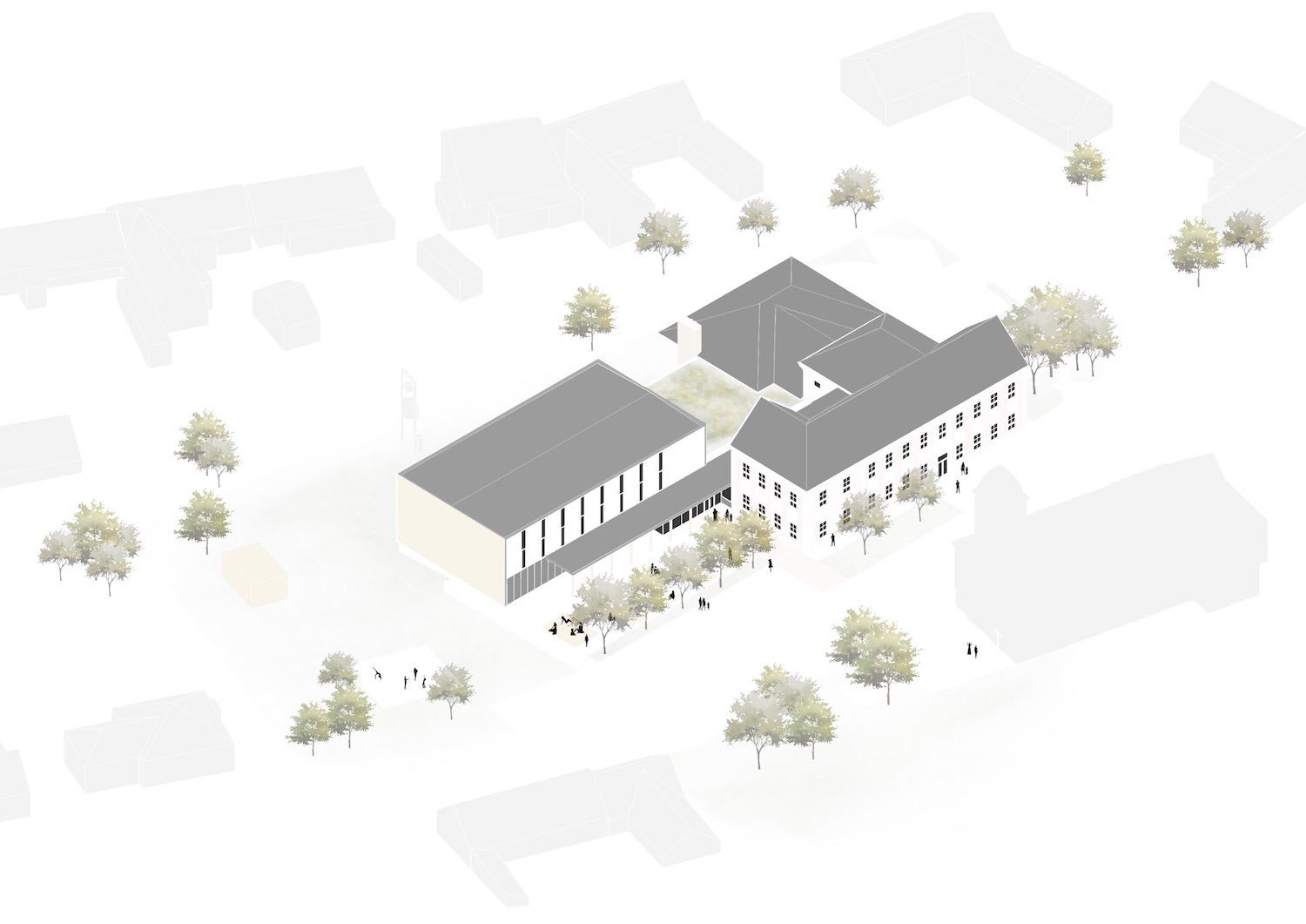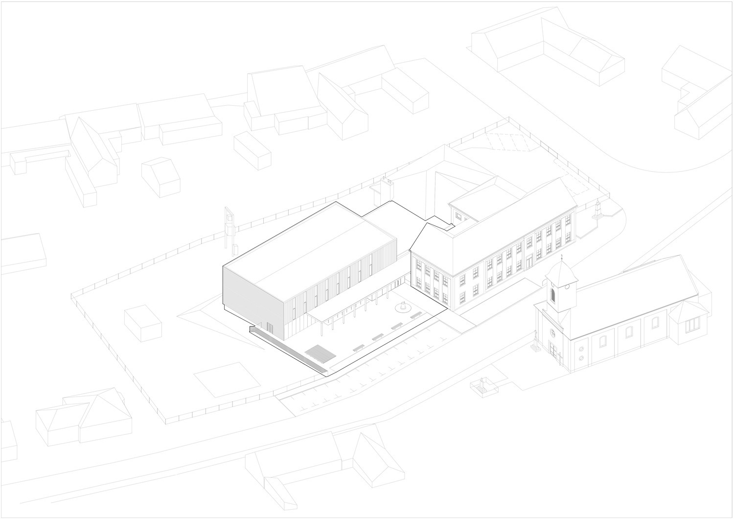 Nižší hmota vyplňuje hluchý prostor, který spolu svírají hmoty hlavní budovy a jídelny a obsahuje šatnu žáků, sborovnu s jednací místností a sociální zázemí. Této hmotě předstupuje nižší arkáda podporována sloupořadím, která v hloubce dispozice přechází v komunikační chodbu a respirium. Trojici hmot dominuje hala, která svou atikou nicméně respektuje římsu stávající školní budovy. Na architekturu budov navazuje moderně pojatý předprostor vybavený odpovídajícím mobiliářem.