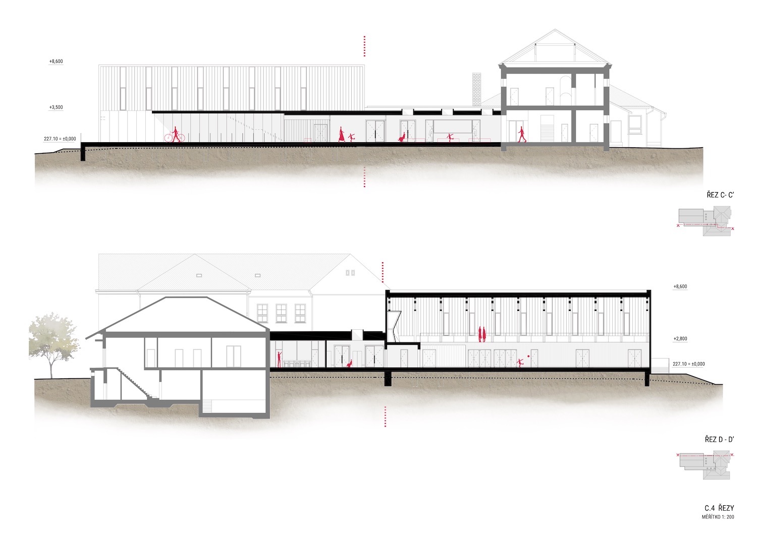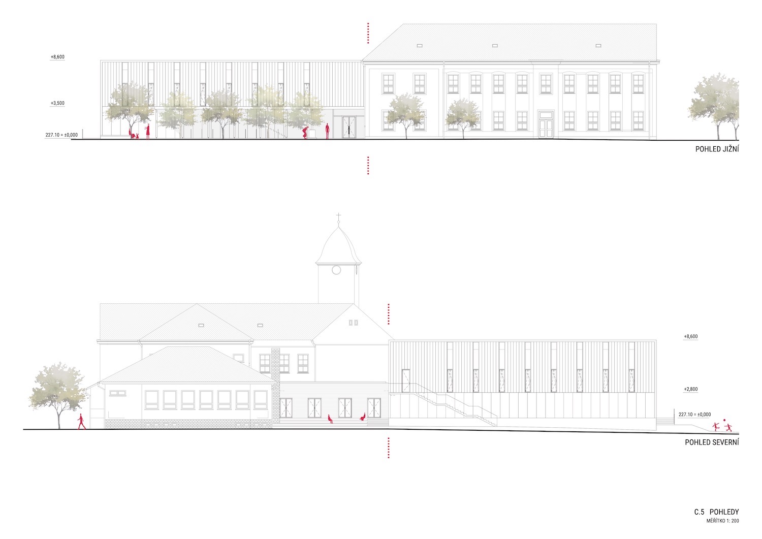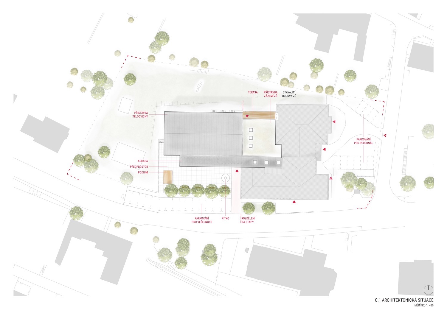 Projekt řeší drobné stavební úpravy stávajícího objektu včetně sanace podlah a přístavbu složenou z rozšíření zázemí školy a tělocvičny se samostatným zázemím. Úpravy ve stávající části objektu se týkají vymístění šaten, zázemí správce a skladu učebnic z důvodu vytvoření prostoru pro novou kmenovou třídu. V místě napojení přístavby je navrženo probourání okenních parapetů na úroveň podlahy a dále vybourání meziokenního pilíře pro příjemnější propojení stávajícího objektu s novým.